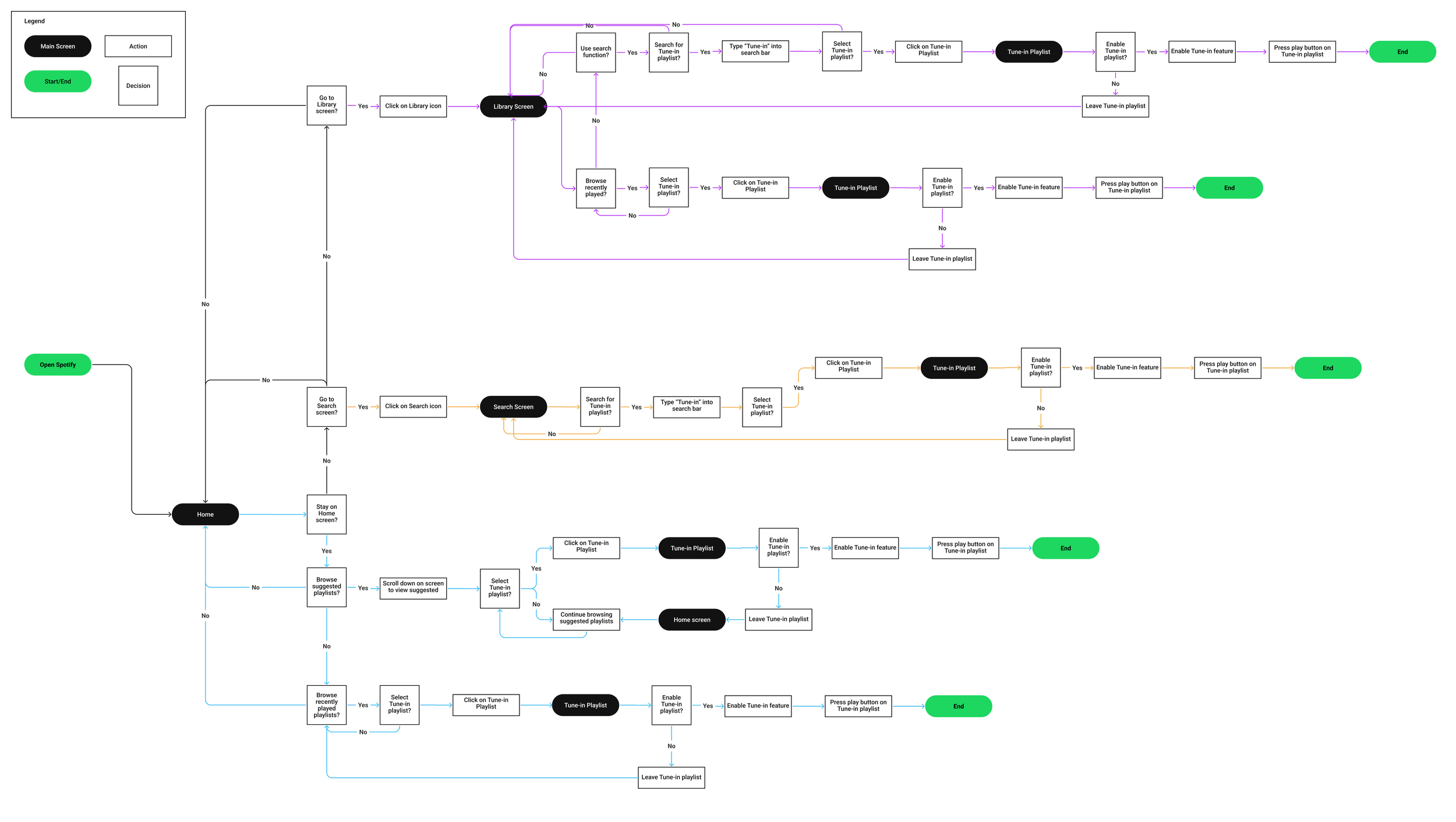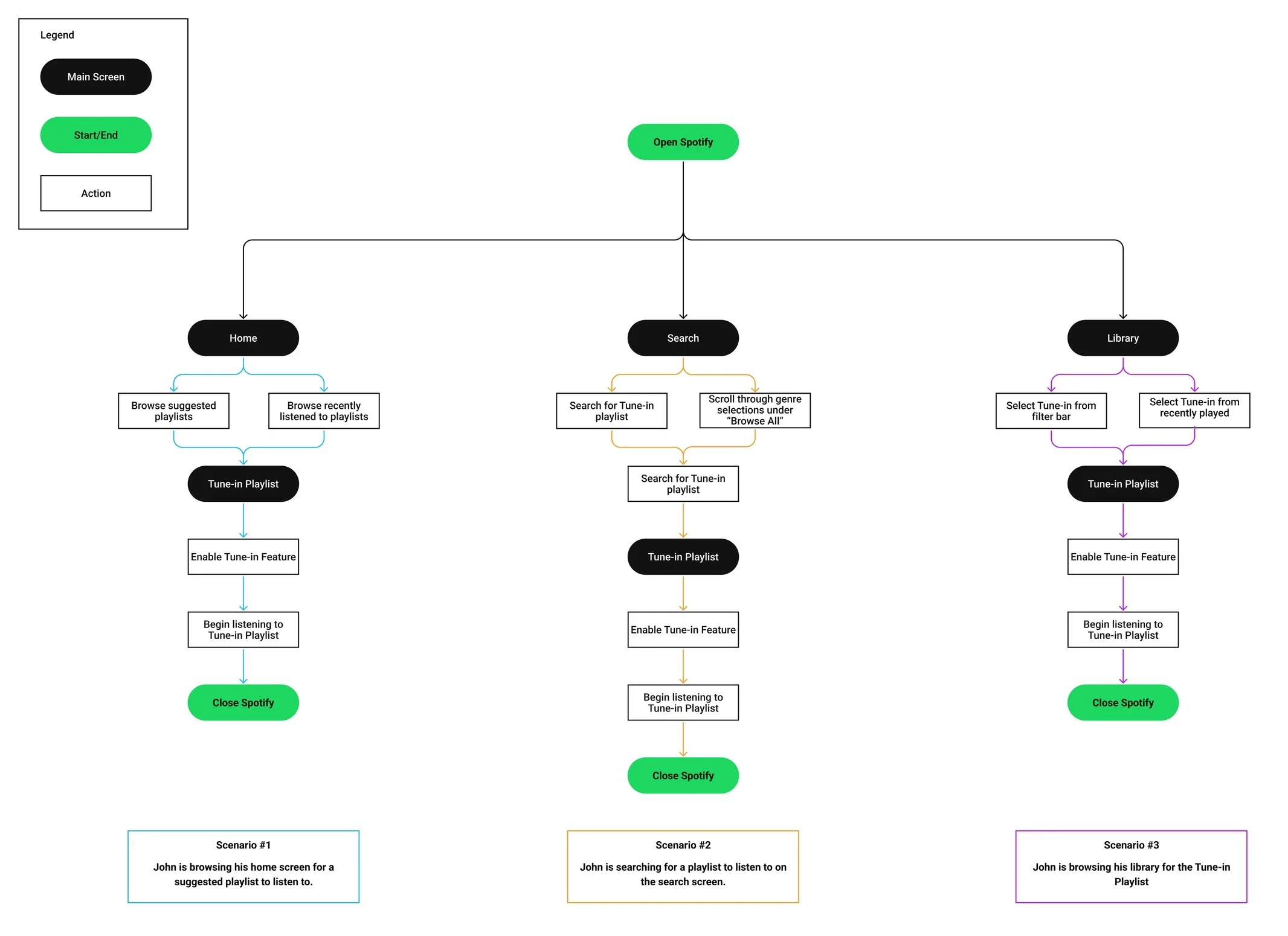 Next steps included outlining a user flow and task flow. This helped determine the natural approach a user would take to access the Tune-in playlist based upon starting on different main nav pages (home page, search page, library page). Task flow was determined first in order to understand the method by which a user would navigate to the Tune-in playlist from a higher level. Then User flow was determined, taking a more detailed, step-by-step look at the process a user would go through to navigate to the Tune-in playlist.