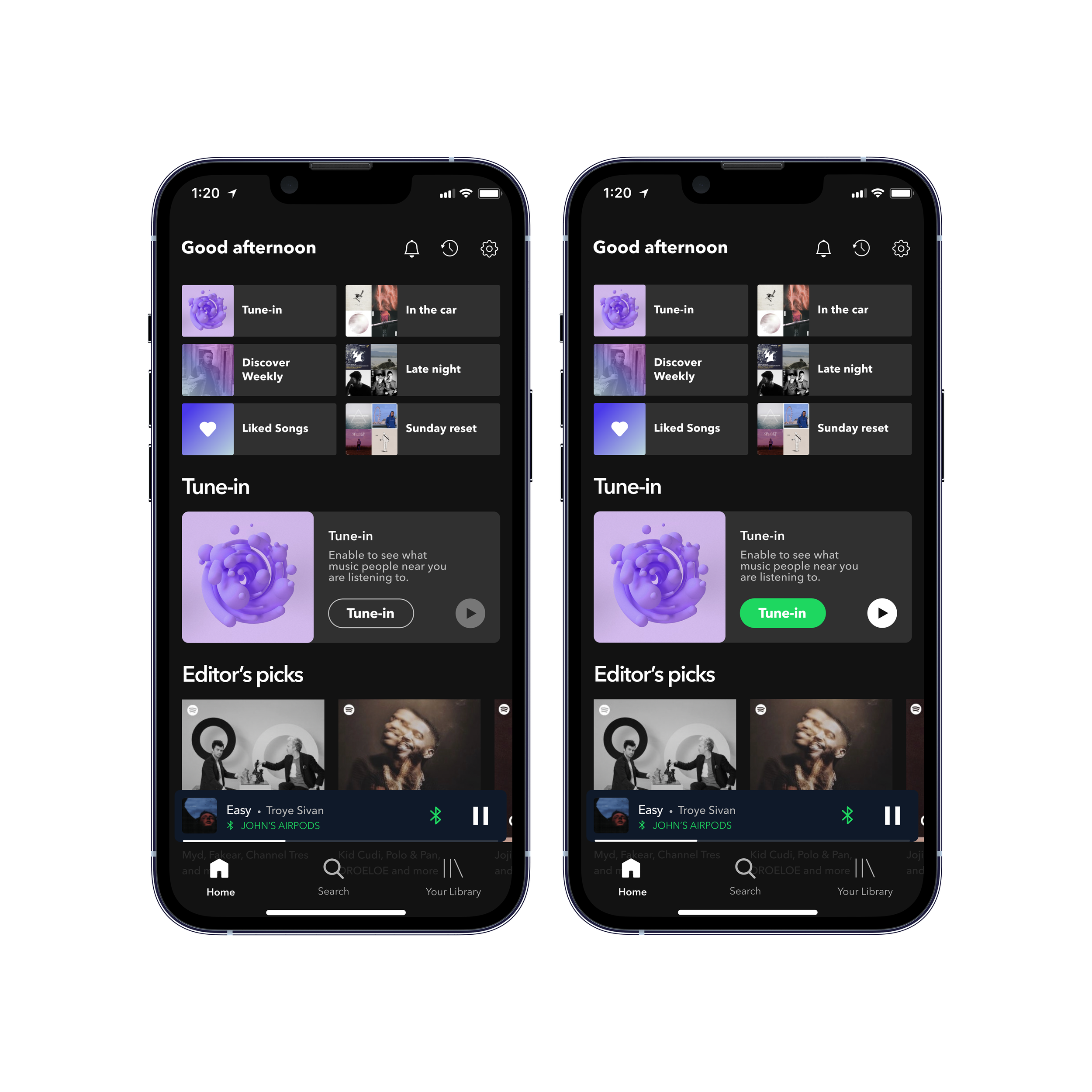 Solution: The solution is to provide a new way for users to discover new music. The Tune-in feature is a playlist, that when enabled, allows users to see what music people are listening to with people in their immediate vicinity as well as share what music they are listening to.