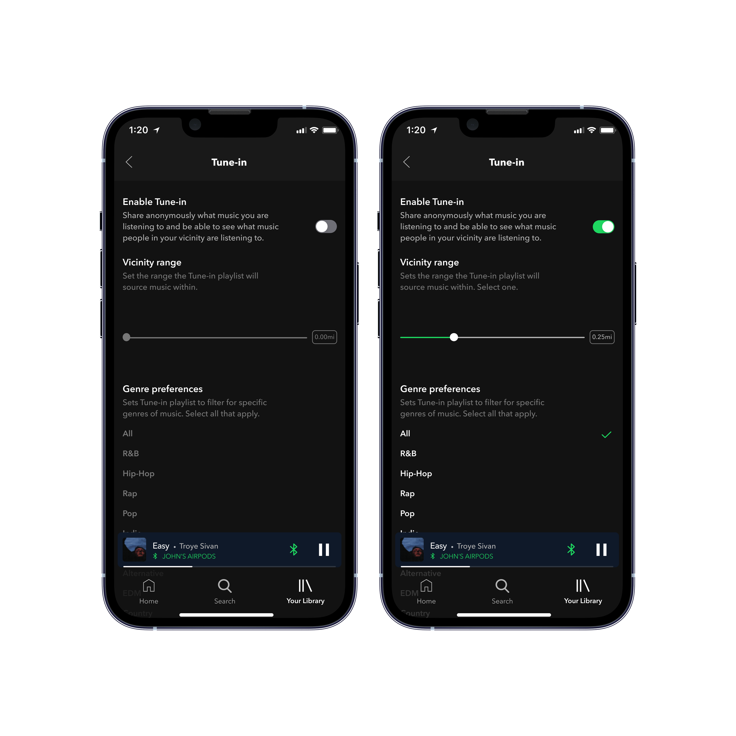 Tune-in settings allow listeners to customize how far away music will source from as well as genre.