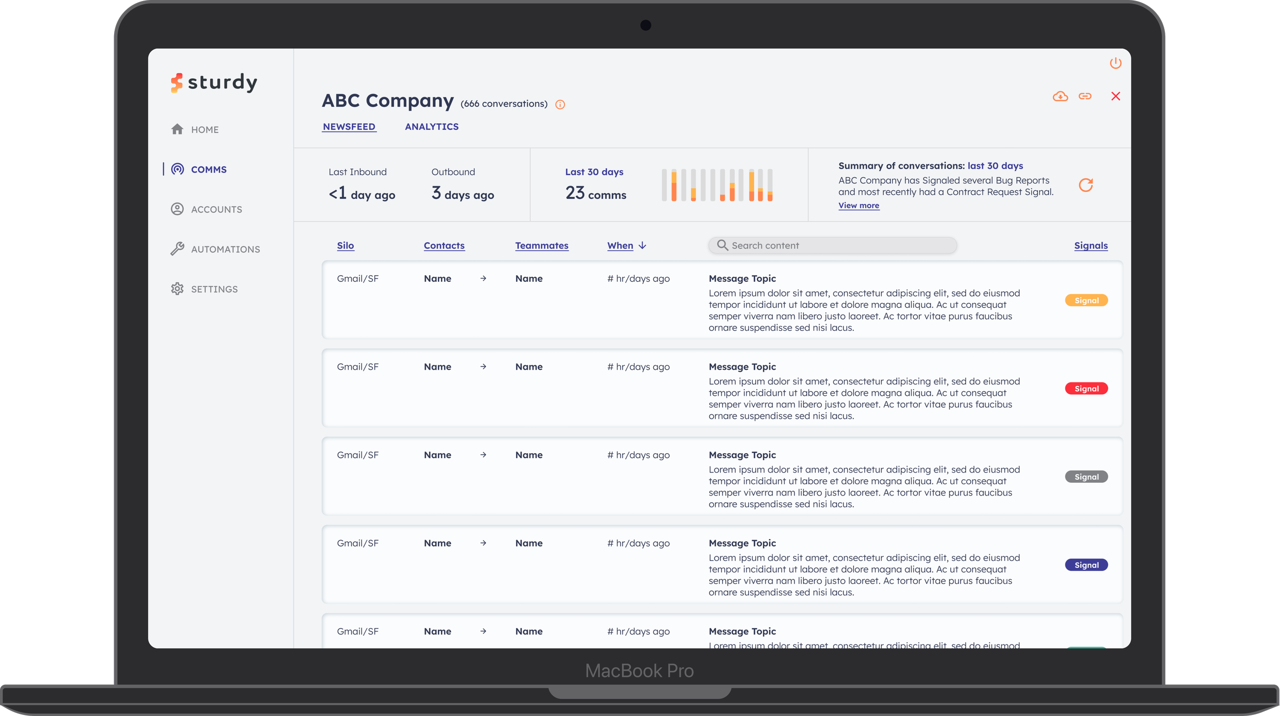 Provide a short summary, long summary, list of most recent Signals associated with the account